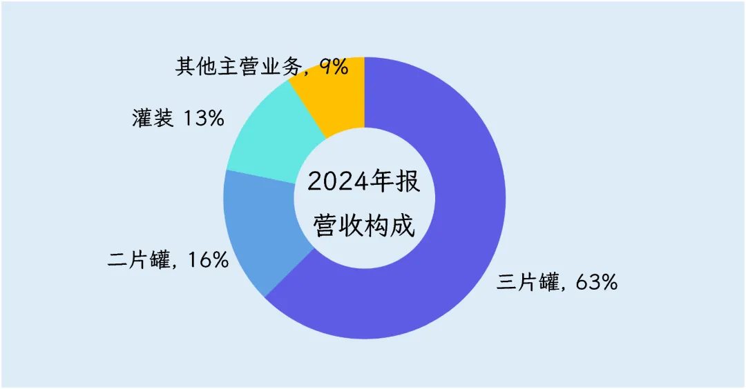 公司主要收入来自三片罐,2024年这条业务给公司贡献了63%的营收,毛利率约19%,算行业里过得去的水平。所谓三片罐,就是罐身、罐底、罐盖三件套,焊在一起,专装那些不带气、要高温杀菌的饮料,像六个核桃、银鹭花生奶、王老吉原味凉茶。