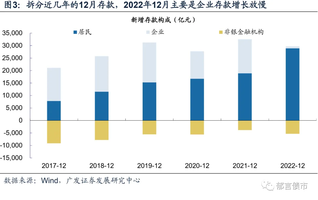 M2同比增速放缓,主要是企业存款拖累。12月M2同比增速较11月放缓0.6个百分点。观察存款结构,居民存款增加2.89万亿元,同比+1.00万亿元;而企业存款增加824亿元,同比-12846亿元。