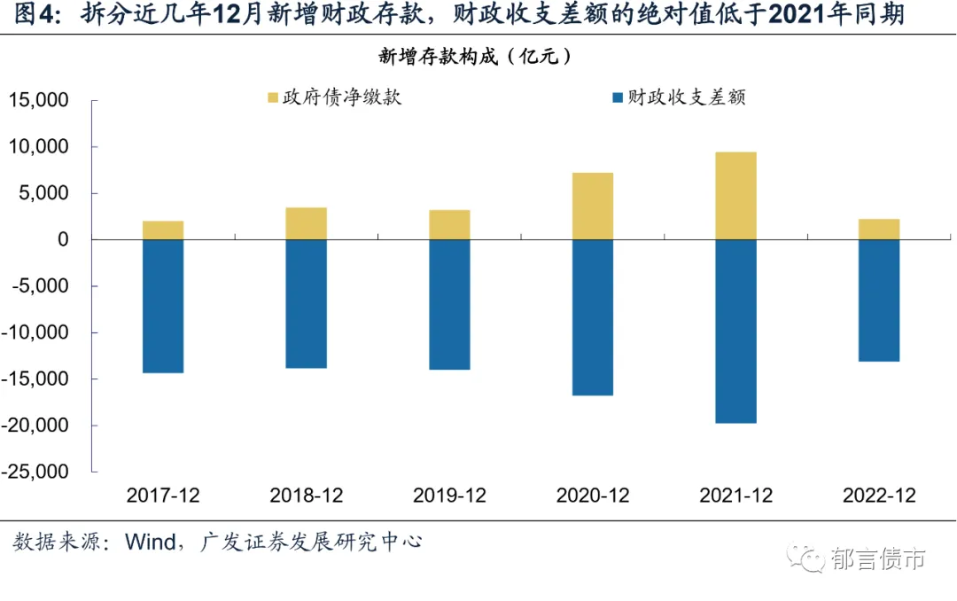 从财政存款来看,12月财政支出力度不及2019-2021年同期。12月财政存款减少10857亿元,2021年同期为减少10302亿元,两者差别不大。但考虑到2022年12月政府债发行量大幅低于2021年同期,可以反推出财政净支出力度不及2021年同期。将财政存款拆分为政府债净缴款和财政收支差额,12月政府债净缴款2259亿元,财政收支差额-13116亿元(收入小于支出,对应为负)。相比于2021年12月财政收支差额为-19755亿元,反映出2022年12月财政净支出力度明显不及2021年同期,也不及2019和2020同期(分别为-14004亿元、-16775亿元)。财政支出可能受限于收入端带来的压力。