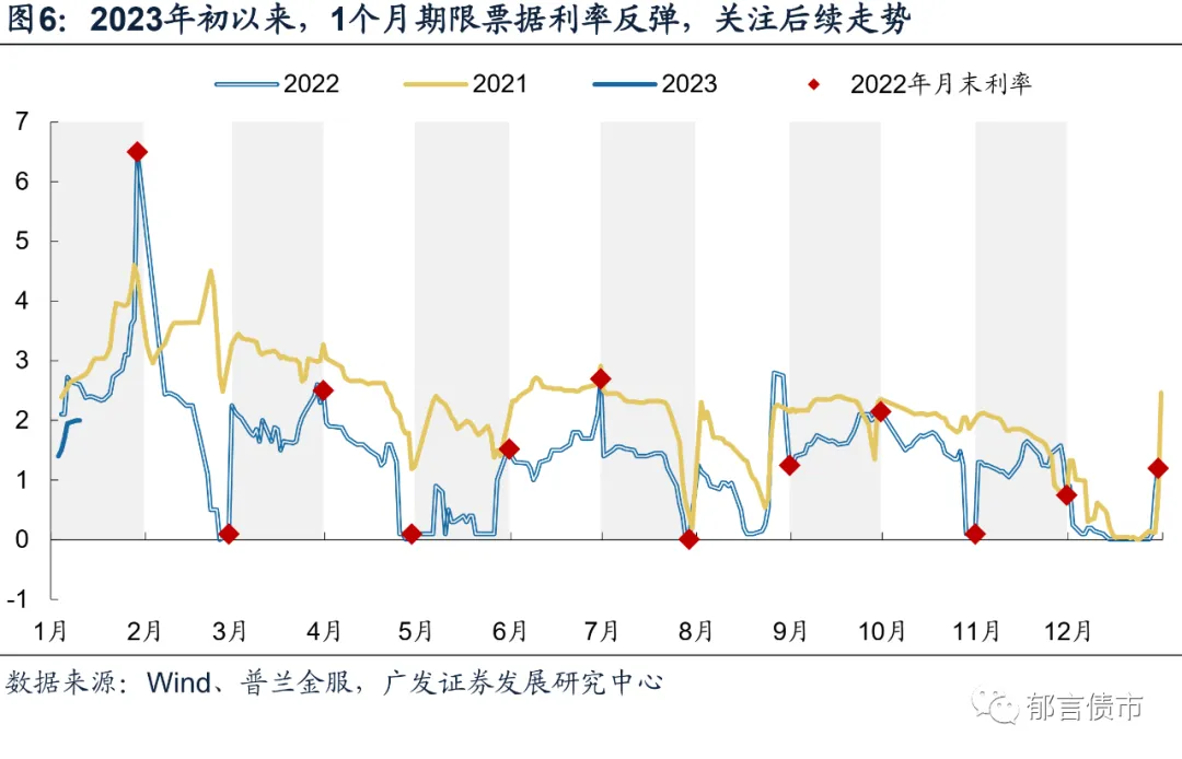 第一阶段的情绪层面冲击,预计发生在2月中旬。重点关注融资需求的反弹幅度,央行2022四季度调查数据显示,融资需求同比较三季度小幅反弹,不过仍然明显低于零。注意到2023年1月初以来,1个月期限的票据利率持续处于较高水平,反映开年融资需求较为强劲。月末票据利率表现值得重点关注。第二阶段对应实体经济趋势上行所带动的长端利率上行,可能出现在3月之后。