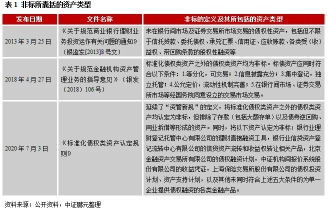 非标的全称为“非标准化债权资产”,其所囊括的资产类型随着监管文件的推出而不断更新,具体如表1所示。目前,非标的最权威认定口径出自央行、银保监会、证监会、外汇局于7月3日联合发布的《标准化债权类资产认定规则》。依照该规则,除现金存款及证券化资产外的所有债权类资产均为非标。