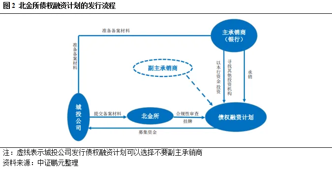 具体来看,债权融资计划是由北金所推出的一种向合格投资者以非公开方式挂牌募集资金的债权性固收产品,很多市场人士将其视为交易商协会PPN的新型“低配”版。之所以说是“低配”版,是因为其对应的发行主体在信用资质上相较PPN会有一定程度的下沉,项目准入上更为宽松。不过,发行债权融资计划虽然对评级(主体、债项)没有强制性要求,也不设置硬性的财务指标,但北金所会通过风险预警体系表来监测财务情况、债务情况,若出现明确的风险提示则会要求城投公司追加增信措施。其创新之处则主要体现在发行流程非常简单、备案材料明显减少、资金用途灵活、资金使用期限灵活等,比如发行流程上只需要主承销商把备案材料做好并提交北金所备案、挂牌后,投资人摘牌即可,从准备材料到发行完毕大约也就2个月的时间周期;再比如募集资金投向在合法合规的前提下(尤其是不新增政府隐性债务)可用于项目建设、补充营运资金和偿还借款等各种用途。总体而言,北金所债权融资计划的操作流程非常简便、快捷(见图2),而且对房地产开发商以外的其他发行主体的项目准入门槛也较为宽松,是目前很适合城投公司选择的融资方式。需要注意的是,与PPN不同,其主承销商必须为银行,而不能是券商投行,这一点需要城投公司注意;同时,建议选择A类主承销商,其业务范围覆盖全国,项目经验也更丰富,若选择B类主承销商则要求其在城投公司所属辖区有分支机构才可。