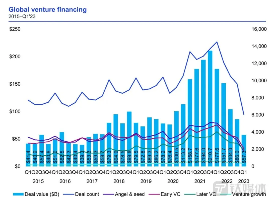 6月初的一天,前微软全球执行副总裁陆奇的奇绩创坛2023春季路演日在北京海淀召开,现场70%的项目都是 AI 大模型。钛媒体App在现场看到,由于疫情放开,加上当前AI大模型热潮涌现,现场人员爆满,连金沙江创业投资基金董事总经理朱啸虎也在现场从头听到尾。不过,钛媒体App在会后与部分投资人交流时了解到,很多VC并没有急于去投资,会后只有个别项目公布了融资信息,大部分投资人基本是询问了解。这和几年前多位投资人冲上前,挤进人群与创始人交流以获得未知领域知识提升情况已迥然不同。只看不投,是这轮投资机构的一个新的变化和现象。在这背后,是硬科技时代下投资环境和投资逻辑发生变化。分享几组数据:2023年第一季度,中国股权投资市场募资端,新募集基金数量和金额分别为1601支、3532.12亿元人民币,同比下降7.6%、33%;投资端,投资案例数共1722起,同比下降44.2%,投资金额为1300.3亿元,同比下降49.8%,硬科技仍为投资主线;退出端,退出案例总量共521笔,同比下滑51.5%,各类退出交易数量均有所减少,其中被投企业IPO共发生372笔,同比下降38.7%。当然这不只是在中国。据毕马威2023年一季度风投报告显示,全球风险投资从2022年第四季度的9619笔、总额8600万美元,下降到今年Q1的6030笔交易、573亿美元,投资总额环比降幅达93%,同时也不到去年第一季度的1/3(1776亿美元),无论是美洲、欧洲还是亚洲,每个地区的风险投资都跌至多年来的最低水平。风险投资面临较大的降幅。来源:毕马威报告