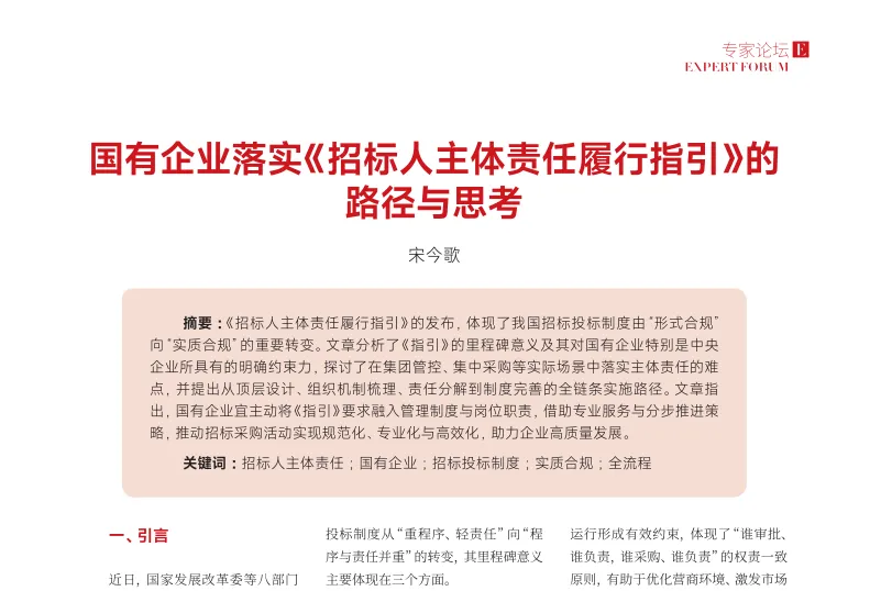 摘要:《招标人主体责任履行指引》的发布,体现了我国招标投标制度由“形式合规”向“实质合规”的重要转变。文章分析了《指引》的里程碑意义及其对国有企业特别是中央企业所具有的明确约束力,探讨了在集团管控、集中采购等实际场景中落实主体责任的难点,并提出从顶层设计、组织机制梳理、责任分解到制度完善的全链条实施路径。文章指出,国有企业宜主动将《指引》要求融入管理制度与岗位职责,借助专业服务与分步推进策略,推动招标采购活动实现规范化、专业化与高效化,助力企业高质量发展。