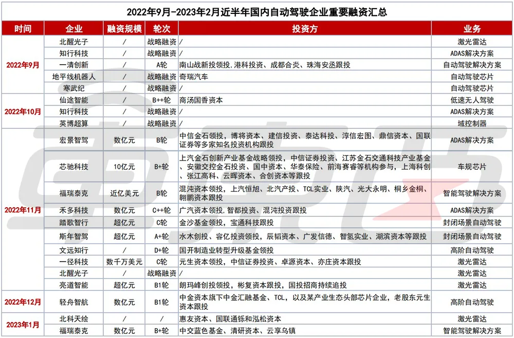 ▲2022年9月~2023年2月近半年国内自动驾驶企业融资汇总