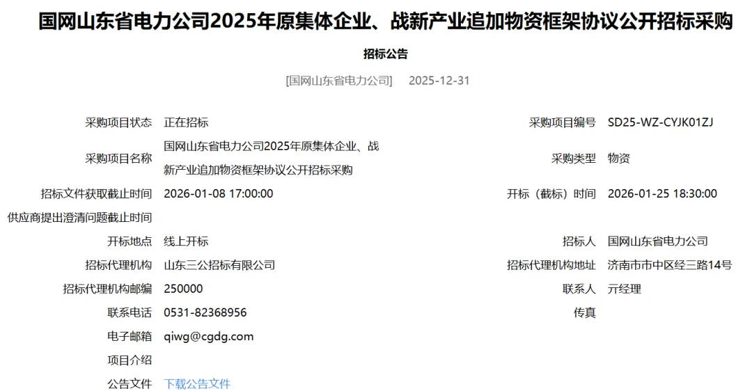 国网山东省电力公司2025年原集体企业、战新产业追加物资框架协议公开招标采购招标公告
