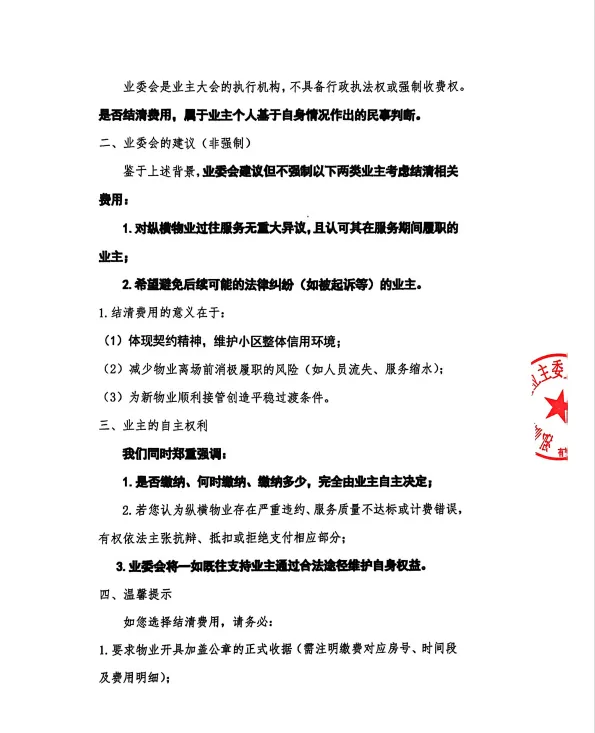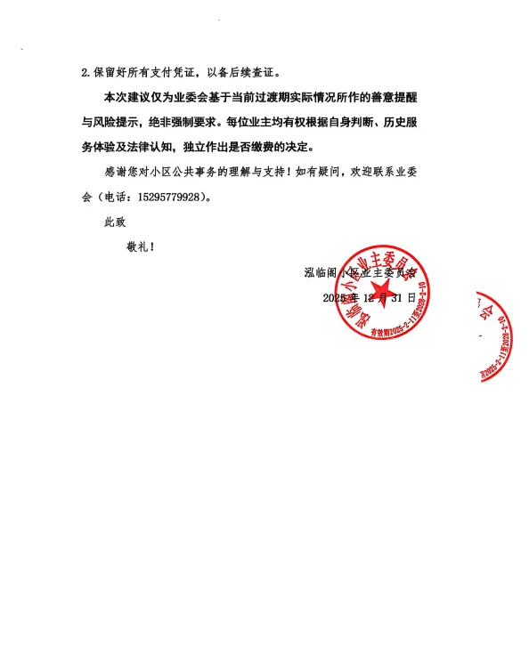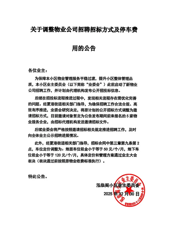 为保障新旧公司交接流程的平稳进行,推进招标事项的顺利发展,经夏港街道指导,业委会发布此建议文件,因招标推进工作中存在有待商榷的事项,此文件发布日期由原日期:2025年12月12日调整为2025年12月31日,详见以下文件内容: