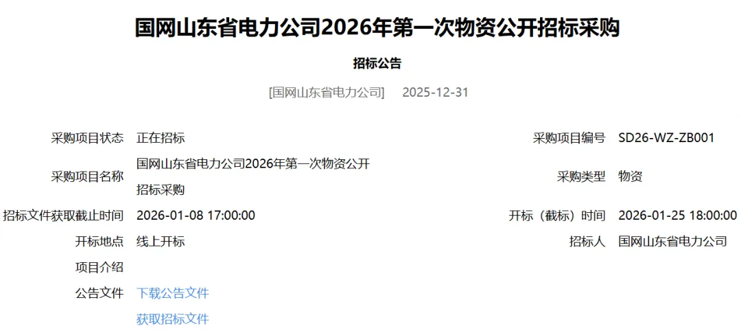 国网山东省电力公司2026年第一次物资公开招标采购招标公告