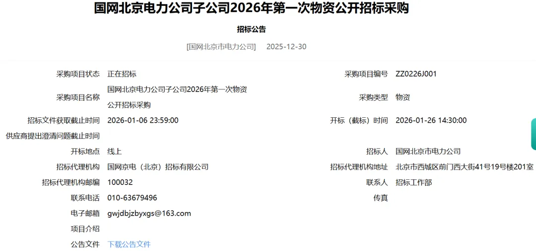 国网北京市电力公司子公司2026年第一次物资招标采购招标公告