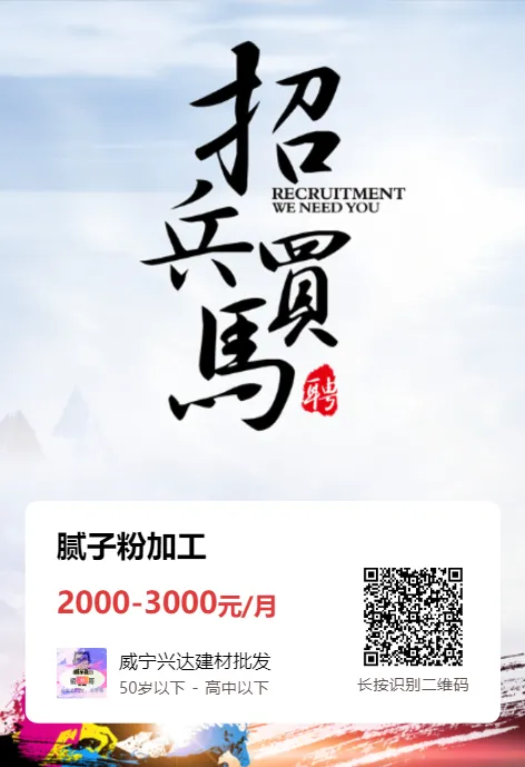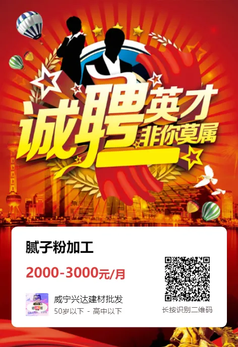威宁兴达建材批发招聘腻子粉加工一名!工资待遇2000-3000+包吃