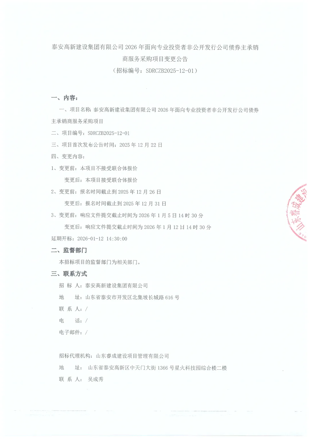泰安高新建设集团有限公司2026年面向专业投资者非公开发行公司债券主承销商服务采购项目变更公告