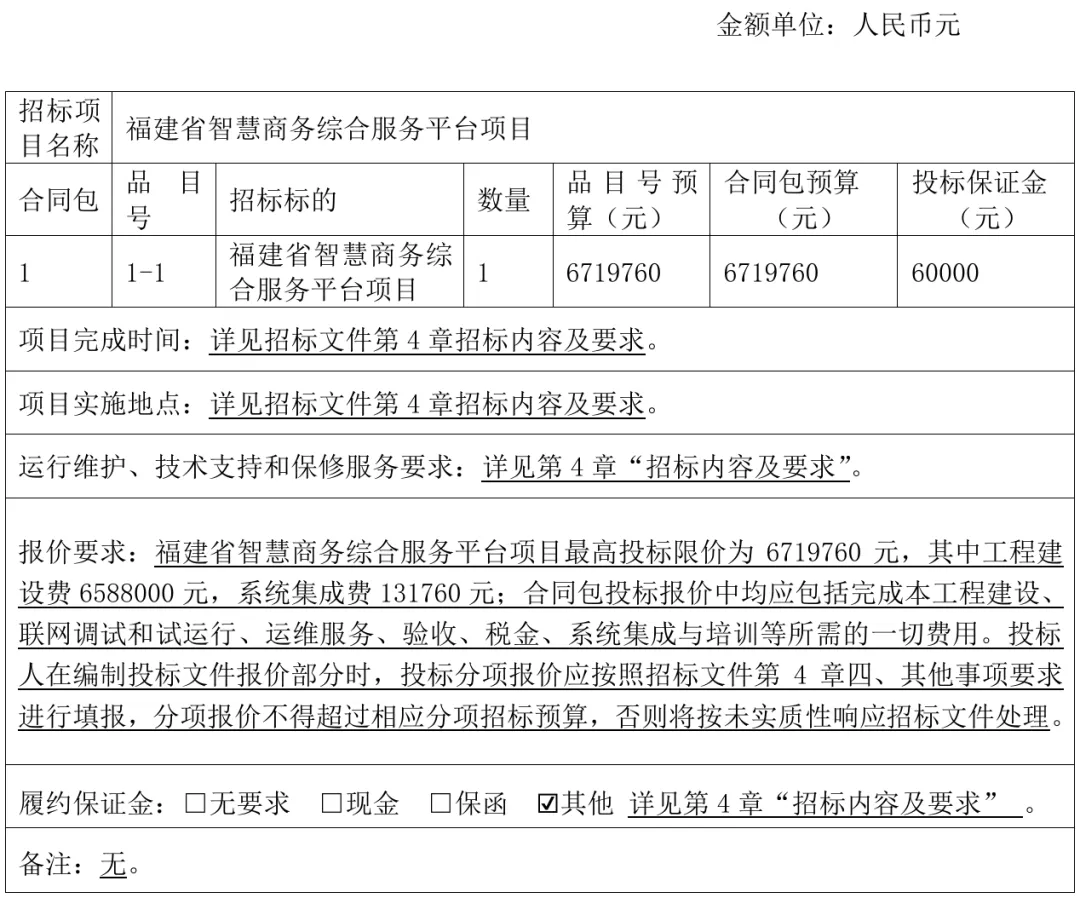 本招标项目福建省智慧商务综合服务平台项目已由 福建省发展和改革委员会以闽发改网审数据函〔2025〕80号批准建设,项目业主为福建省电子政务建设运营有限公司,建设资金来自财政拨款和企业自筹,招标人为福建省电子政务建设运营有限公司,委托的招标代理单位为福建优胜招标项目管理集团有限公司 。本项目已具备招标条件,现对该项目进行公开招标。