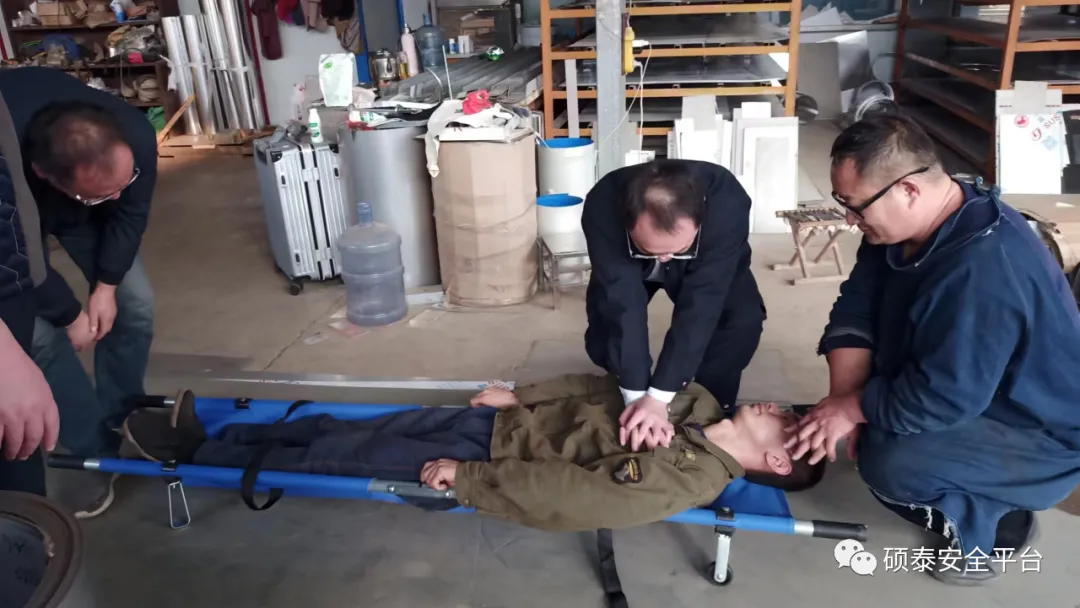 中心提前制订详细的演练方案,设置疏散组、抢救组、后勤组,明确指挥人员和分工职责,模拟一名工人在进行工作过程中发生触电事故。工人在施工现场模拟触电,现场管理人员路过巡查发现后第一时间切断电源拨打急救电话,立即启动应急预案并上报市场管理处。救援小组立即按分工展开救援。疏散组负责疏散现场无关人员,维持现场秩序;抢救组将伤者立即移至安全地带,并将其身体平放在地面上,伤者已处于昏迷状态中,立即对其进行体外胸部按压和人工呼吸,直至其心肺复苏,同时后勤组做好各项保障工作,待120急救车辆快速赶到,应急救援小组协助医护人员将伤者送往医院做进一步身体治疗检查。