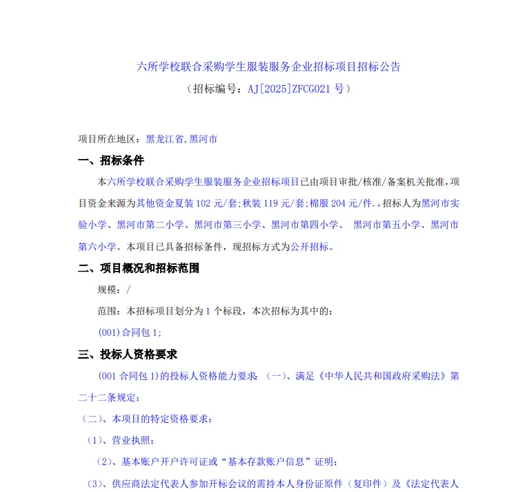 项目名称:六所学校联合采购学生服装服务企业招标项目招标公告发布日期:2025-10-24