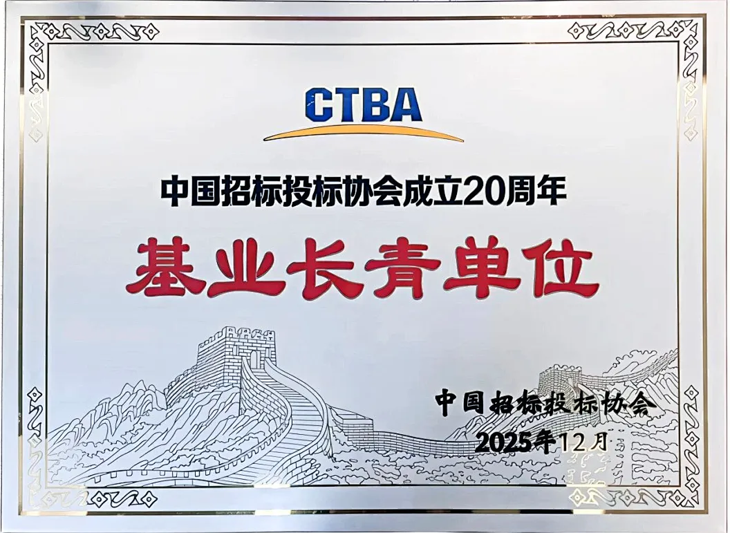责任,沉淀为基业长青的基石。 在中国招标投标协会成立20周年之际,我们荣膺“基业长青单位”。这份称号,致敬的是我们的过去,更是我们面向未来的承诺:专业与诚信,是我们所有丰碑最稳固的地基。