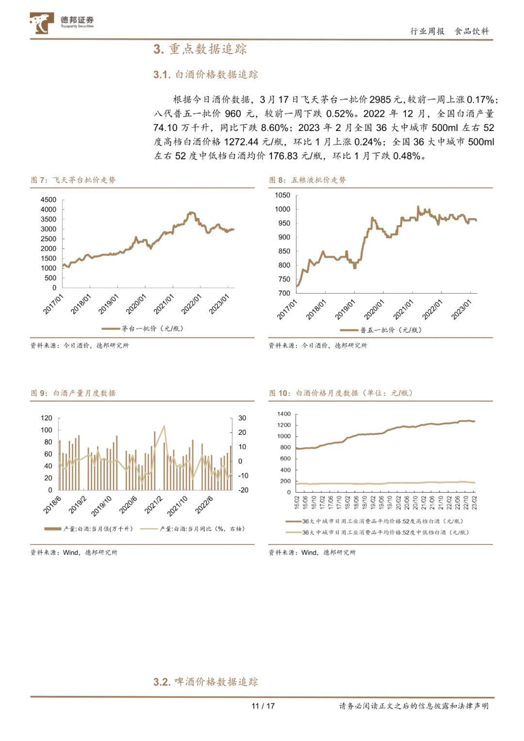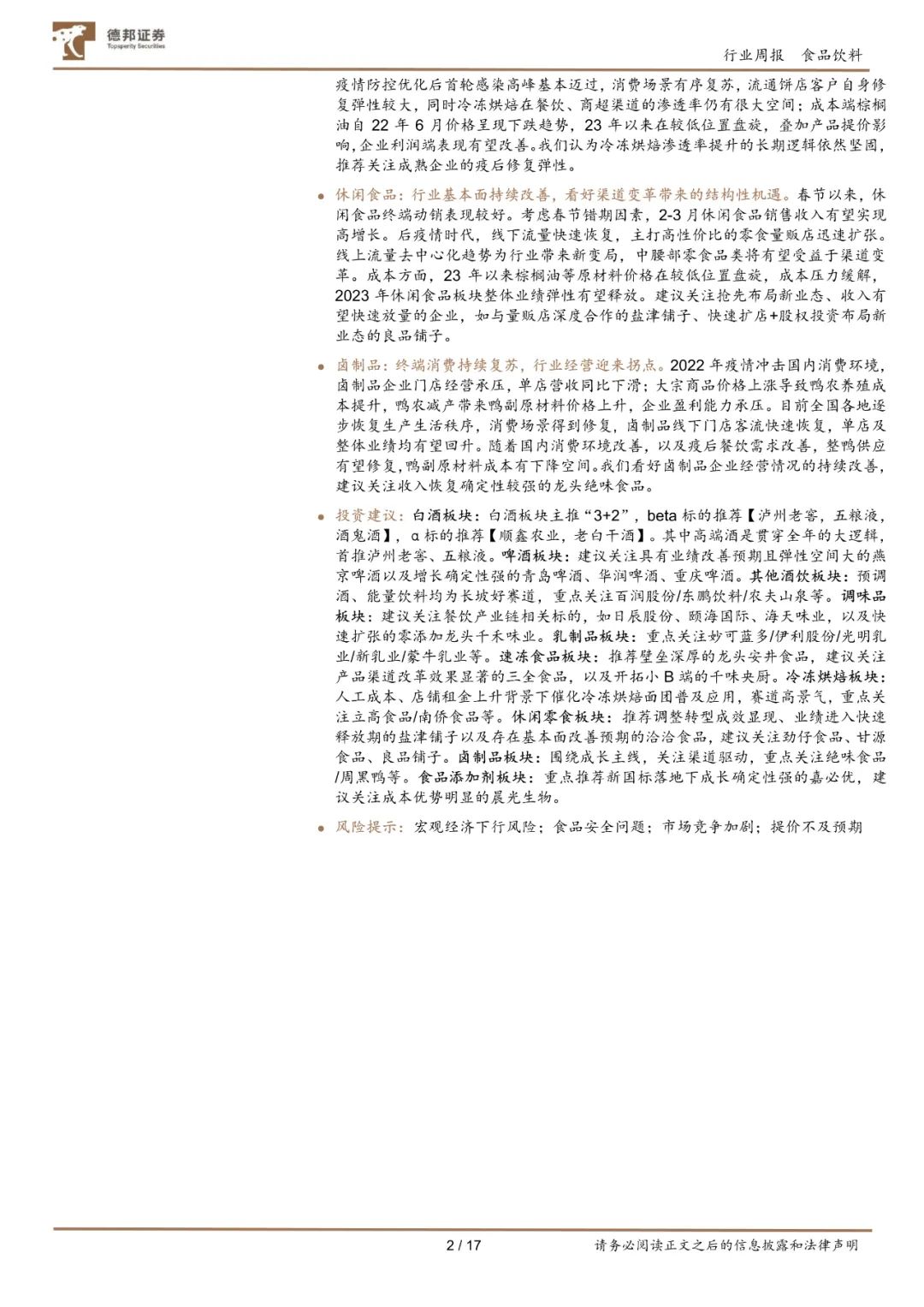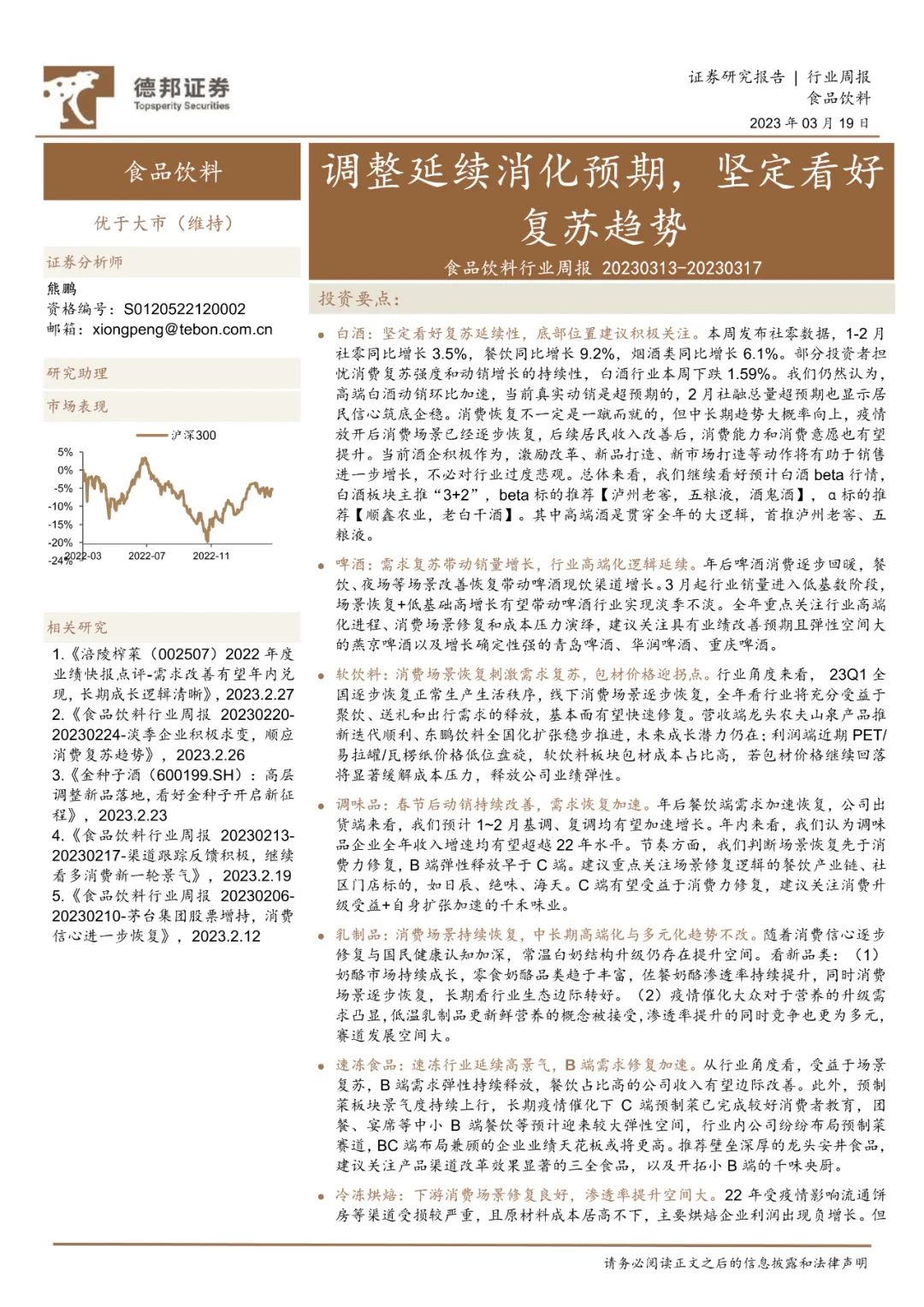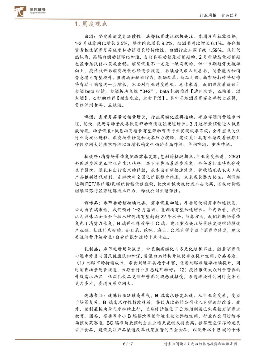 啤酒:需求复苏带动销量增长,行业高端化逻辑延续。年后啤酒消费逐步回暖,餐饮、夜场等场景改善恢复带动啤酒现饮渠道增长。3 月起行业销量进入低基数阶段,场景恢复+低基础高增长有望带动啤酒行业实现淡季不淡。全年重点关注行业高端化进程、消费场景修复和成本压力演绎,建议关注具有业绩改善预期且弹性空间大的燕京啤酒以及增长确定性强的青岛啤酒、华润啤酒、重庆啤酒。