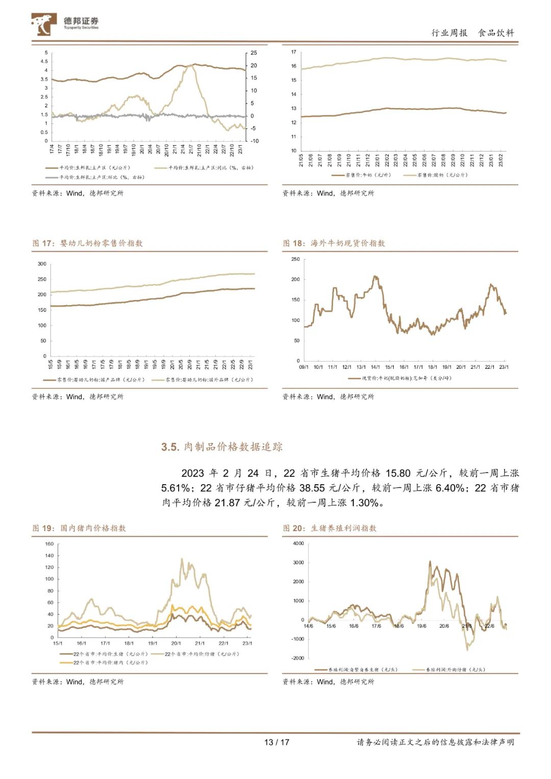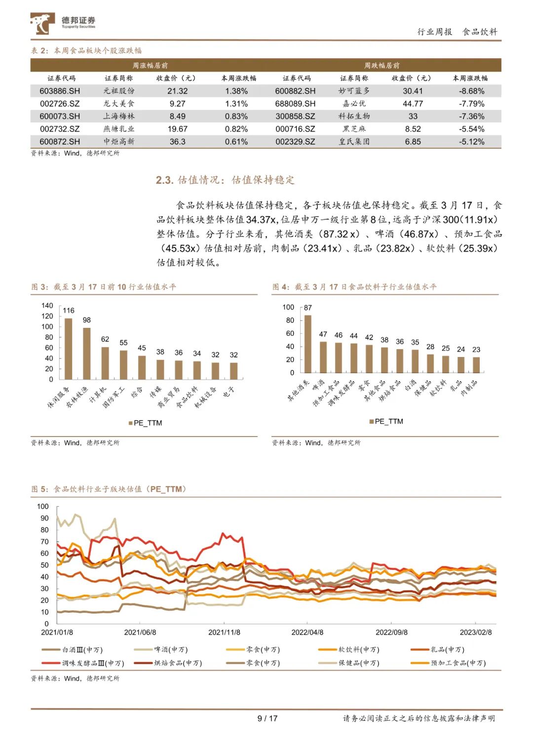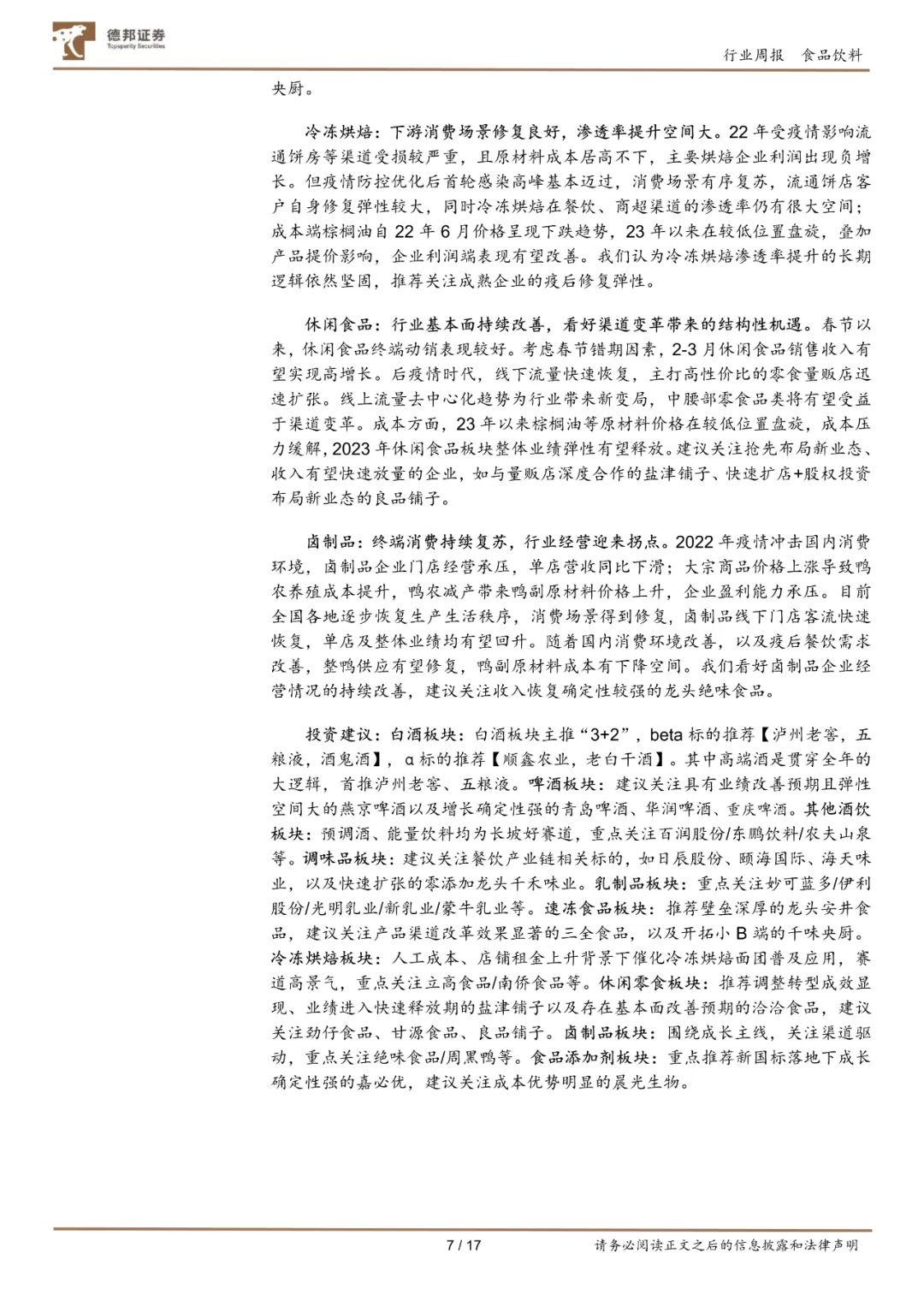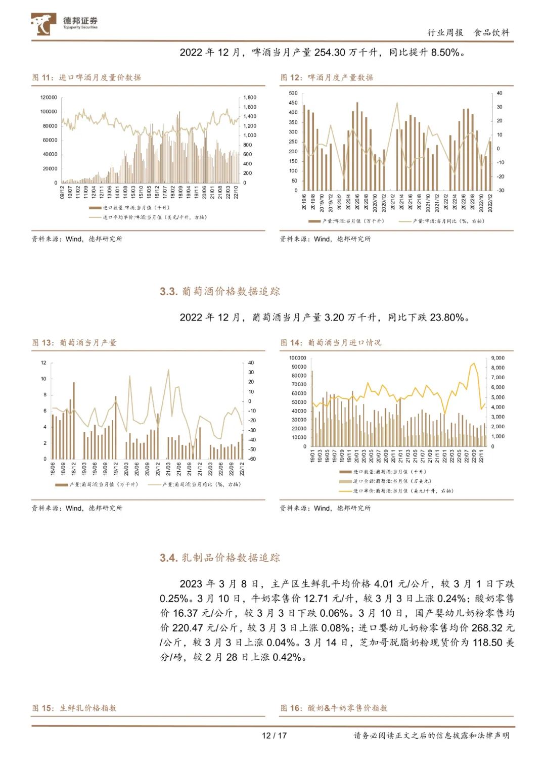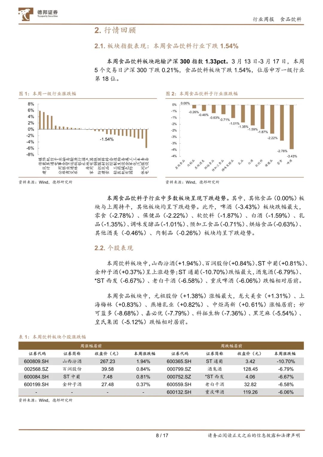 啤酒:需求复苏带动销量增长,行业高端化逻辑延续。年后啤酒消费逐步回暖,餐饮、夜场等场景改善恢复带动啤酒现饮渠道增长。3 月起行业销量进入低基数阶段,场景恢复+低基础高增长有望带动啤酒行业实现淡季不淡。全年重点关注行业高端化进程、消费场景修复和成本压力演绎,建议关注具有业绩改善预期且弹性空间大的燕京啤酒以及增长确定性强的青岛啤酒、华润啤酒、重庆啤酒。