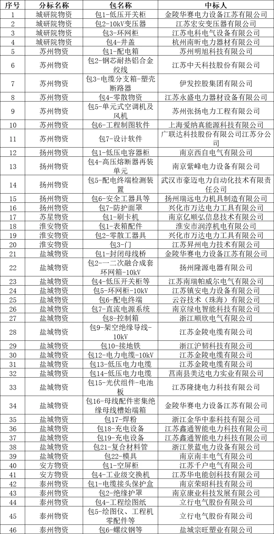 国网江苏电力2025年原集体企业第十次物资公开招标采购-1项目的中标候选人公示活动已经结束。现将中标人名单公告如下: