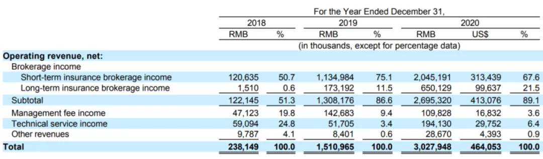 水滴公司的营收主要来自于保险经纪业务。招股书显示,水滴公司保险经纪业务收入从2018年的占比51.3%增长至2020年末的89.1%。2020年,水滴公司首年保费收入超过144亿元,之前两年这一项分别为9.73亿元、66.68亿元。2018年、2019年、2020年分别贡献营收1.22亿元、13.08亿元和26.95亿元。