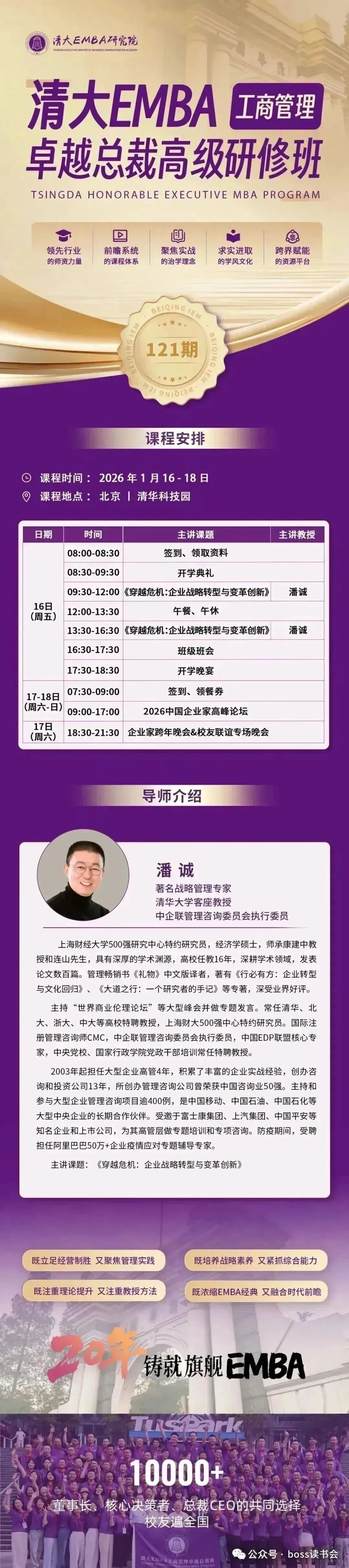 所有老板都值得读一遍的EMBA商学课程!本期学费:29800元/年 学制一年 毕业后可终生免费复训学习1月16-18日开学典礼 第121期(新班开学)