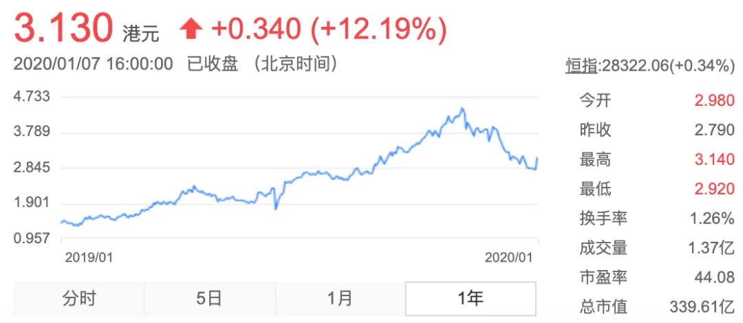 2019年11月11日盘中,波司登股价一度涨至4.5港元,创上市以来的最高价。实际上,波司称得上2019年港股市场的牛股之一。截至2020年1月7日收盘,其股价报3.13港元,总市值339.61亿港元,较一年前大涨200亿港元。