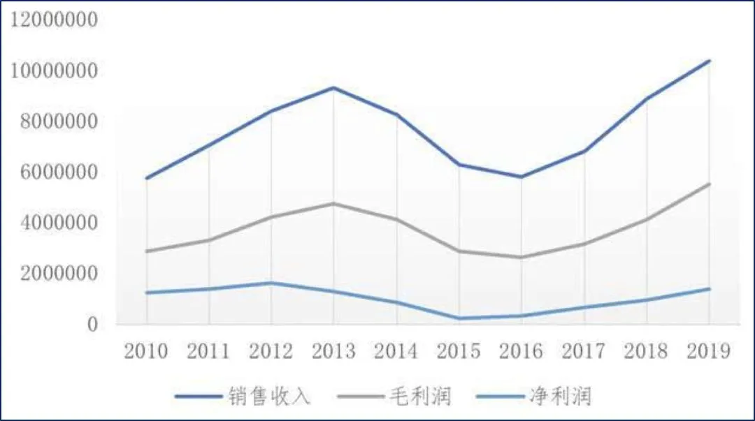 波司登2010至2019年销售收入及利润情况(数据来源:波司登年报)