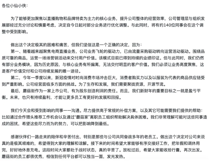 对于裁员,蘑菇街给出的理由是:公司聚焦电商直播业务,将由流量采购驱动转向运营活动驱动。