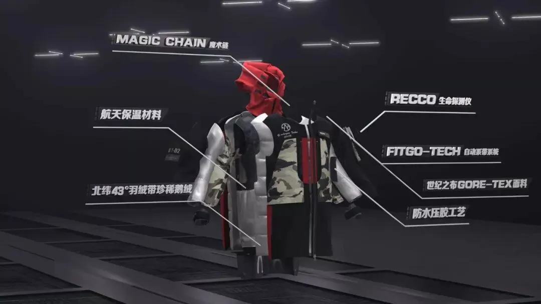“选用北纬43°黄金羽绒带的顶级鹅绒、‘世纪之布’GORE-TEX面料和航天纳米保温材料,应用蜂巢立体充绒、防水压胶处理、RECCO生命探测仪等尖端工艺和科学技术,经过489道工序制作而成。”