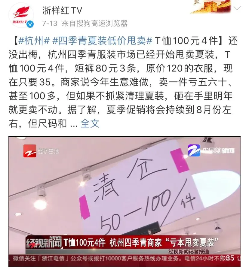 大部分消费者对服装的消费需求减少,今年的夏季清仓“早到晚退”,淡季足足提前了2个月!
