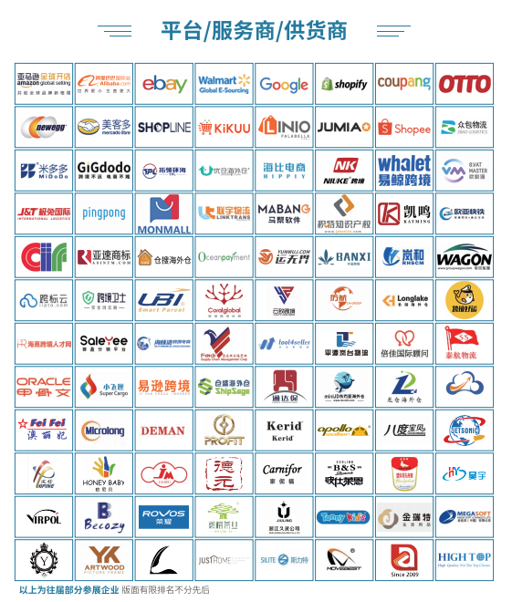2022年秋跨展示全国超100万件智造新品,北至黑龙江,西至宁夏,东至山东,全国跨境电商强省全部参展,参展主力多来自外贸传统产业带,澄海玩具、晋江运动鞋服、临沂编织、南通健身器材、绍兴纺织、许昌假发等外向型知名特色产业带集合于一展,再现了“东西相济,南北互通”的行业盛况。相比去年,本届展会的协办单位、行业支持单位、特约合作单位明显增多,代表性更广,龙头性更足。参展企业涵盖供应链、平台、仓储、物流、资本、财税、营销、软件、运营、人才等跨境电商全生态链。亚马逊全球开店、eBay、沃尔玛、谷歌、新蛋、领英等众多平台,以及甲骨文、纵腾、泛鼎、紫讯、店匠、星谷等行业实力服务商联手参与。在采购商邀请方面,预计吸引约8万名专业采购商到会。