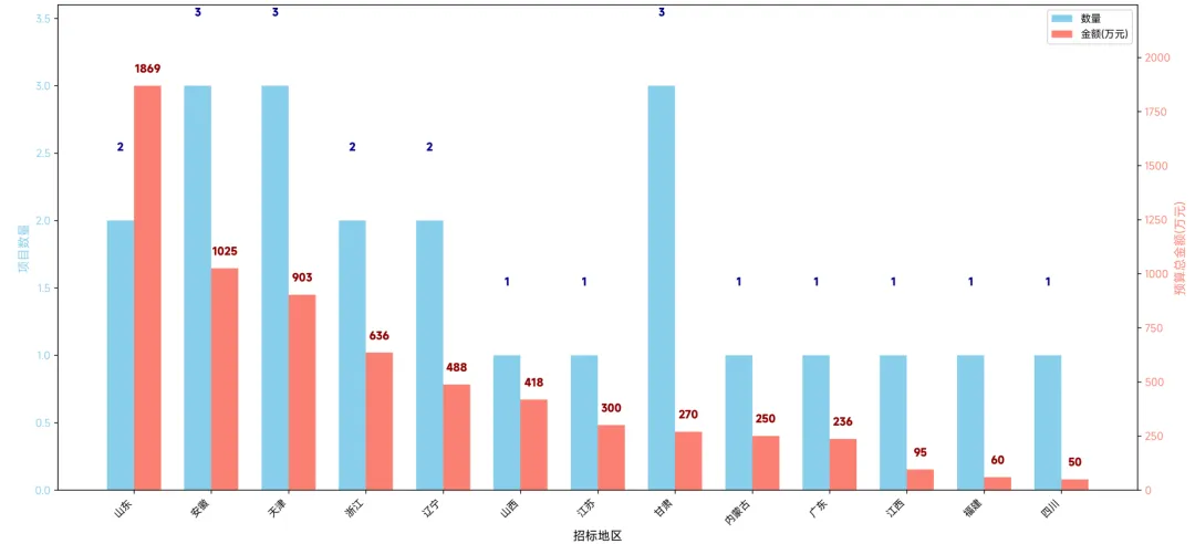 :山东(1,869万元,2个项目),安徽(1,025万元,3个项目),天津(903万元,3个项目)。