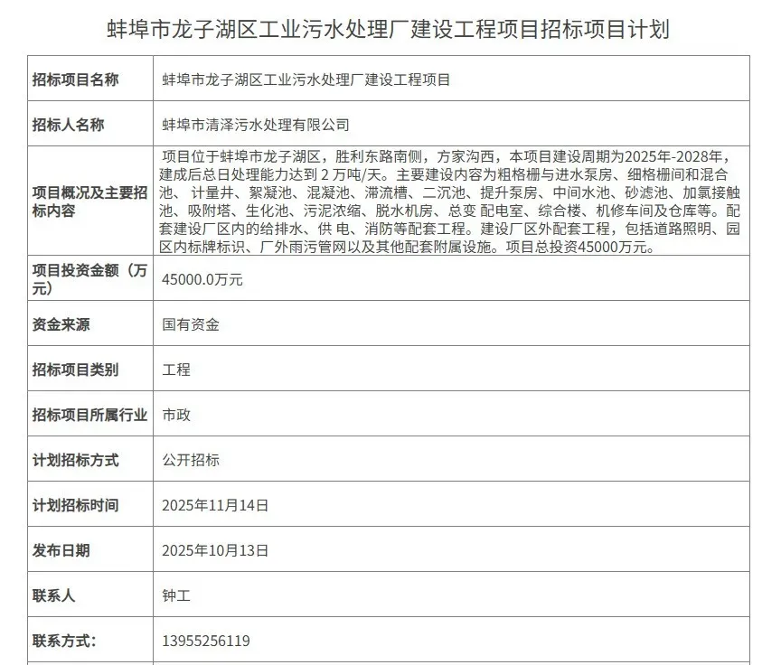 10月13日,安徽省蚌埠市龙子湖区工业污水处理厂建设工程发布招标计划。