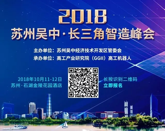 2018苏州▪吴中长三角智造峰会10月11日-12日举行,本次峰会围绕机器人产业投资机会、核心零部件国产化进程、中国机器人市场机会、制造业升级与机器人系统集成等主题展开探讨。点击底部“阅读原文”免费报名。