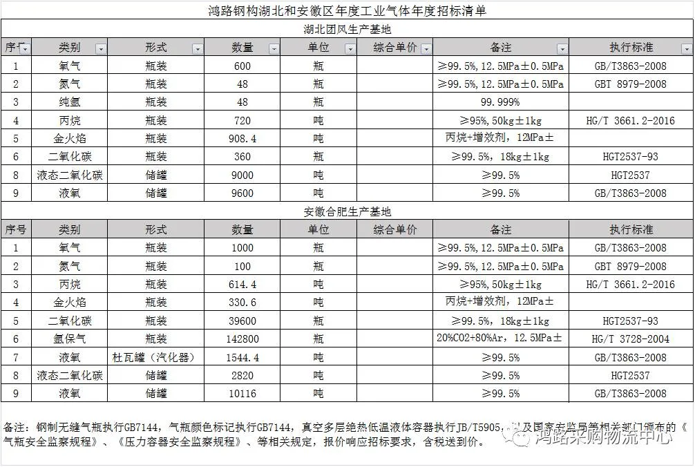 1、投标人所报价格应包括气体价格、气体运杂费、装卸费、设备安装调试费、税金(提供17%增值税专用发票)等可能涉及到的全部费用。瓶装为到厂价,储罐装气体为通过管道到工位价。招标清单中每项可单独报价也可部分或全部报价,此报价作为招标人评标依据,但不能限制招标人以其他方式签订合同的权利。