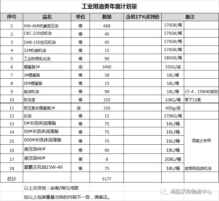 二、招标内容:抗磨液压油、齿轮油、空压机油、机械机油、锂基脂、柴油机油、防冻液、白油、半流体润滑脂