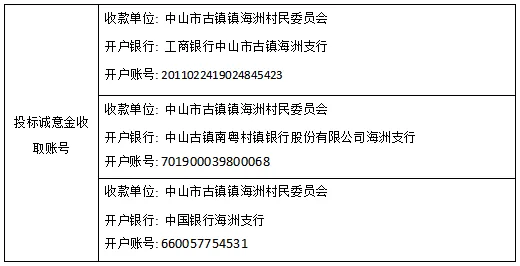 投标单位须于2021年5月31日下午4:00前交投标诚意金人民币2000万元(大写:贰仟万元整)(以到帐单时间为准),凭银行转账凭证到中山市古镇镇海洲村股份合作经济联合社财务室开具投标诚意金收据,获得“竞投资格确认书”,一张投标诚意金收据换取一块投标板,一块投标板即为一个投标资格。