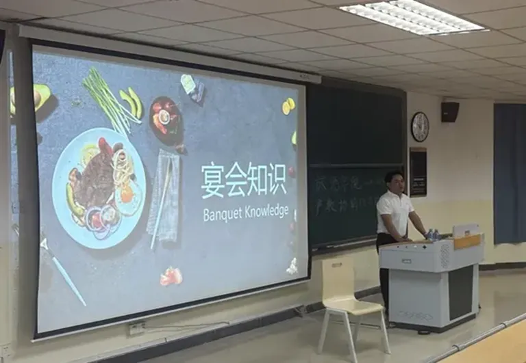 主动拥抱 AI 时代教育变革,将人工智能技术全面融入专业教学各环节。召开 “课程改革与 AI 结合研讨会”“高价值岗位研讨会”,明确 AI 赋能会展人才培养的核心方向。《宴会活动策划与组织》课程开展沉浸式教学,运用 AI 技术优化宴会设计流程与效果呈现;《绿色会展》相关教学中,解锁 “碳密码” 背后的数字化管理工具,培养学生绿色智慧会展实操能力。通过 AI 技术与课程内容的深度融合,不仅提升了教学的趣味性与实效性,更让学生提前掌握自贸港会展业高价值岗位所需的数字化技能。