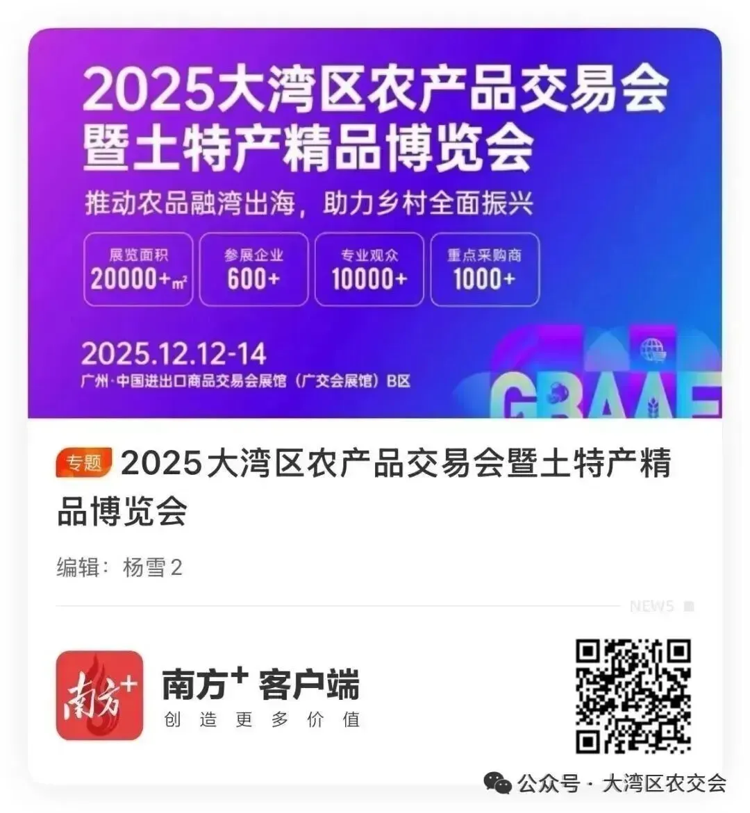 2025大湾区农交会汇聚20+展团、近6万观众,斩获超亿元意向采购订单。这不止是一场展会,更是农业“融湾出海”的澎湃浪潮!“媒体+”赋能,让每一份乡土珍品都被看见。感谢所有参与者和见证者,满载收获,共赴新程!