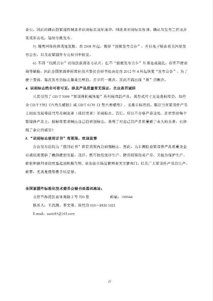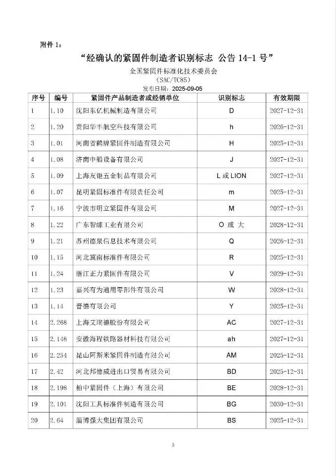 友友们,做紧固件生意的、采购相关产品的,都来凑个热闹!2025年9月5日,全国紧固件标准化技术委员会发了个超重要的公告——《经确认的紧固件制造者识别标志公告14-1号》,简单说就是给行业里的企业发"官方身份证"啦!