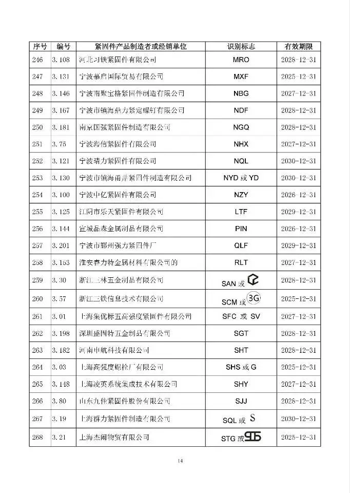 友友们,做紧固件生意的、采购相关产品的,都来凑个热闹!2025年9月5日,全国紧固件标准化技术委员会发了个超重要的公告——《经确认的紧固件制造者识别标志公告14-1号》,简单说就是给行业里的企业发"官方身份证"啦!
