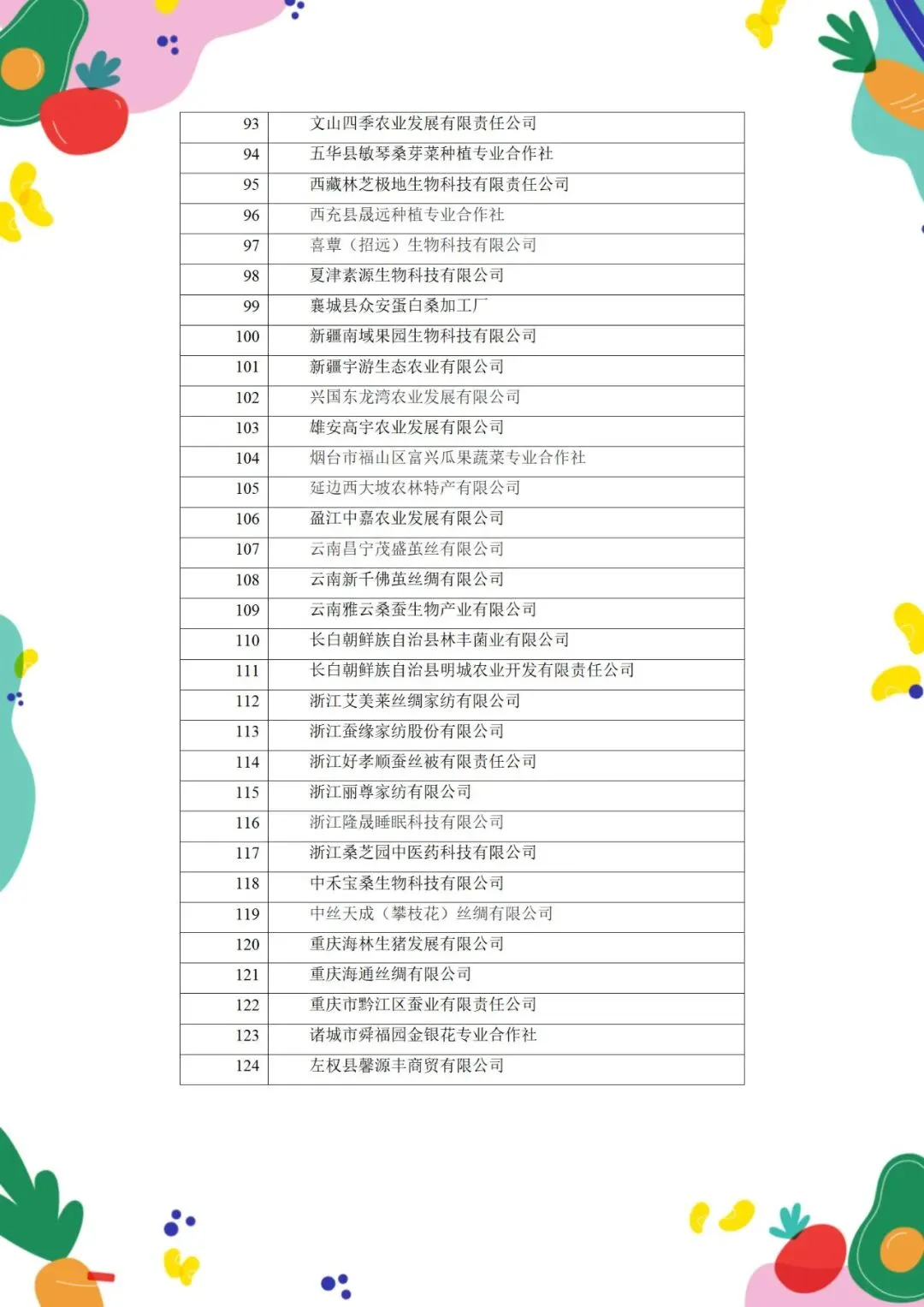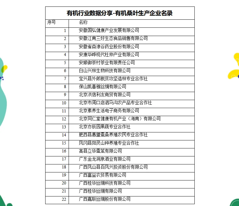中国的有机桑叶产业依托传统蚕桑基础,正朝着药食同源的大健康方向快速发展。该产业主要分为上游有机原料种植和下游有机提取物及制品两个紧密关联的领域。针对控糖、降脂等具体健康需求的功能性食品和保健品将成为研发热点,桑叶提取物是一个增长明确的细分市场。目前,经过中国有机认证的桑叶生产加工企业共有124家,具体如下: