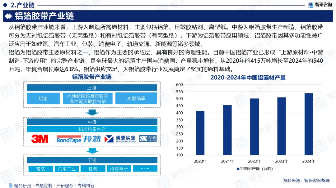 铝箔胶带是一种以铝箔为基材,表面涂布高性能压敏胶粘剂(如丙烯酸胶或橡胶胶)的复合型胶带。其核心特点是耐高温、耐腐蚀、导电性强,并具备优异的密封和屏蔽性能。从铝箔胶带产业链来看,上游为制造所需原材料,主要包括铝箔、压敏胶粘剂、离型纸。中游为铝箔胶带生产制造,铝箔胶带可分为无衬纸铝箔胶带(无离型纸)和有衬纸铝箔胶带(有离型纸)。下游为铝箔胶带应用领域,铝箔胶带因其多功能性被广泛应用于如建筑、汽车工业、包装、消费电子、轨道交通、新能源等诸多领域。铝箔胶带是胶粘带重要组成部分,近年来,铝箔胶带作用不断显现,随着下游市场不断发展,铝箔胶带需求量持续增加,2023年中国铝箔胶带销售量突破4亿平方米,2024年销售量进一步扩大至4.2亿平方米,占胶粘带总销量的0.97%,占比较小。伴随着销售量稳步增长,铝箔胶带销售额也呈现扩张态势,2024年中国铝箔胶带销售额达30亿元,较2023年同比增长7.1%,占胶粘带总销售额的4.1%,高于销量占比。2020-2024年期间,中国铝箔胶带销售均价较为稳定,维持在7.0元/平方米-7.5元/平方米之间,其中2024年销售均价为7.14元/平方米,远高于胶带整体销售均价(1.68元/平方米),附加值较高。目前,国内铝箔胶带制造企业数量较多、较分散,包括3M等外资厂商与邦特科技、美源实业、日邦科技、永冠新材等本土企业。市场竞争较为激烈,国内铝箔胶带厂商愈发重视产品的研发创新和为客户提供定制化综合解决方案的能力。在我国产业结构调整和升级的大背景下,铝箔胶带行业整合和升级也将提速,能够持续研发新技术新产品、具有工艺先进性和较强的生产成本控制能力的企业将会成为行业龙头,技术实力弱的中小厂商将面临被市场淘汰的危机。未来,我国铝箔胶带行业将朝着产品性能增强、市场集中度提升、应用场景拓展的方向发展。