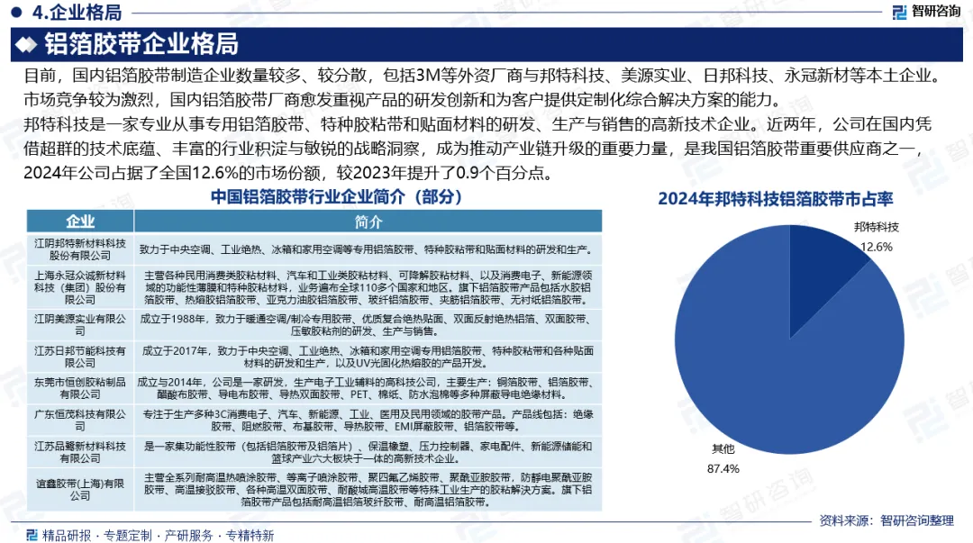 企业格局:目前,国内铝箔胶带制造企业数量较多、较分散,包括3M等外资厂商与邦特科技、美源实业、日邦科技、永冠新材等本土企业。市场竞争较为激烈,国内铝箔胶带厂商愈发重视产品的研发创新和为客户提供定制化综合解决方案的能力。