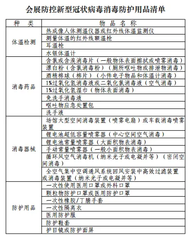 展会举办单位、场馆单位应提前采购足量口罩、消毒水、洗手液、温度计等防疫物资(详见附表)。