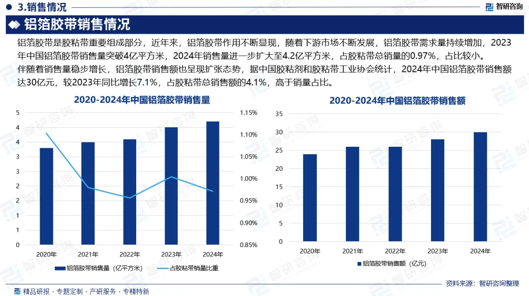 铝箔胶带是一种以铝箔为基材,表面涂布高性能压敏胶粘剂(如丙烯酸胶或橡胶胶)的复合型胶带。其核心特点是耐高温、耐腐蚀、导电性强,并具备优异的密封和屏蔽性能。从铝箔胶带产业链来看,上游为制造所需原材料,主要包括铝箔、压敏胶粘剂、离型纸。中游为铝箔胶带生产制造,铝箔胶带可分为无衬纸铝箔胶带(无离型纸)和有衬纸铝箔胶带(有离型纸)。下游为铝箔胶带应用领域,铝箔胶带因其多功能性被广泛应用于如建筑、汽车工业、包装、消费电子、轨道交通、新能源等诸多领域。铝箔胶带是胶粘带重要组成部分,近年来,铝箔胶带作用不断显现,随着下游市场不断发展,铝箔胶带需求量持续增加,2023年中国铝箔胶带销售量突破4亿平方米,2024年销售量进一步扩大至4.2亿平方米,占胶粘带总销量的0.97%,占比较小。伴随着销售量稳步增长,铝箔胶带销售额也呈现扩张态势,2024年中国铝箔胶带销售额达30亿元,较2023年同比增长7.1%,占胶粘带总销售额的4.1%,高于销量占比。2020-2024年期间,中国铝箔胶带销售均价较为稳定,维持在7.0元/平方米-7.5元/平方米之间,其中2024年销售均价为7.14元/平方米,远高于胶带整体销售均价(1.68元/平方米),附加值较高。目前,国内铝箔胶带制造企业数量较多、较分散,包括3M等外资厂商与邦特科技、美源实业、日邦科技、永冠新材等本土企业。市场竞争较为激烈,国内铝箔胶带厂商愈发重视产品的研发创新和为客户提供定制化综合解决方案的能力。在我国产业结构调整和升级的大背景下,铝箔胶带行业整合和升级也将提速,能够持续研发新技术新产品、具有工艺先进性和较强的生产成本控制能力的企业将会成为行业龙头,技术实力弱的中小厂商将面临被市场淘汰的危机。未来,我国铝箔胶带行业将朝着产品性能增强、市场集中度提升、应用场景拓展的方向发展。