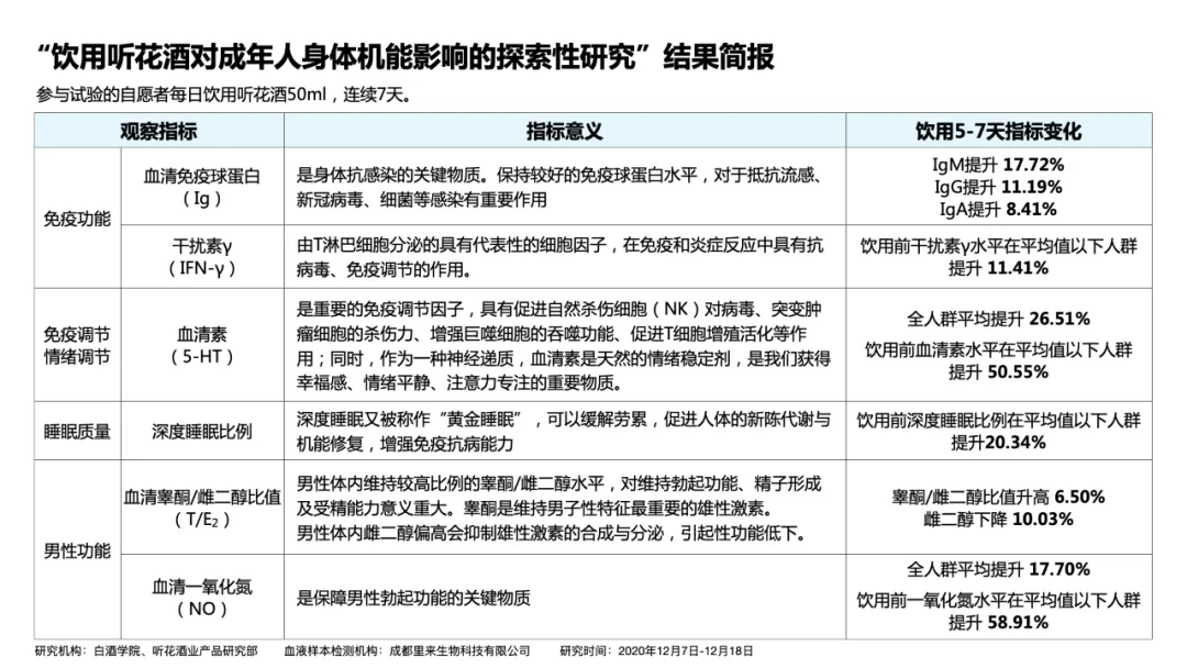 2021年1月21日,中国网报道了《饮用听花酒对成年男性身体机能影响的探索性研究》结果简报。这份由听花酒联合第三方机构针对人体短期饮用听花酒后功能性探索的研究报告,是近年白酒行业鲜见的数据化成果验证。