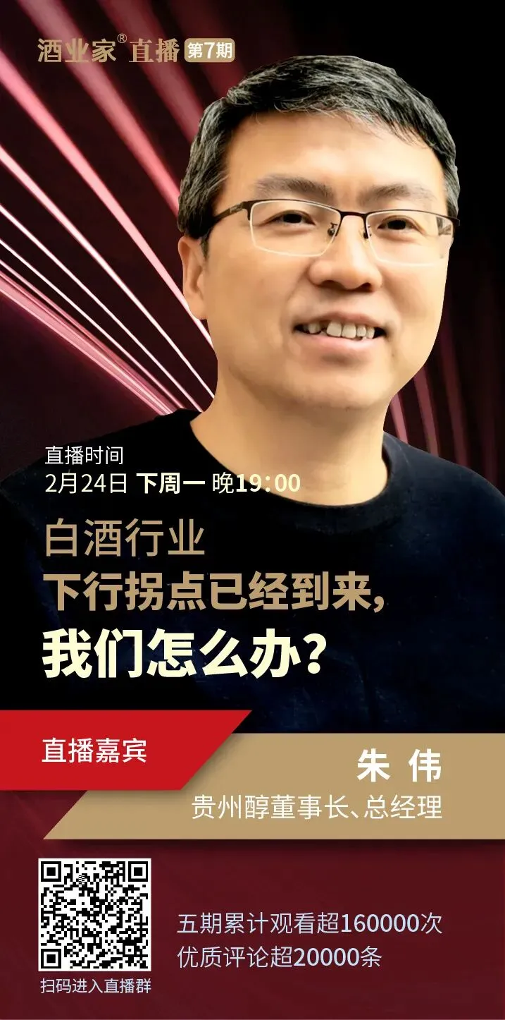 2月24日,“新晋酒业网红”、贵州醇酒业董事长、总经理朱伟将做客酒业家直播间。朱伟认为,目前白酒行业下行拐点已经到来,围绕这一论断,朱伟将带来怎样的方法论和思考?
