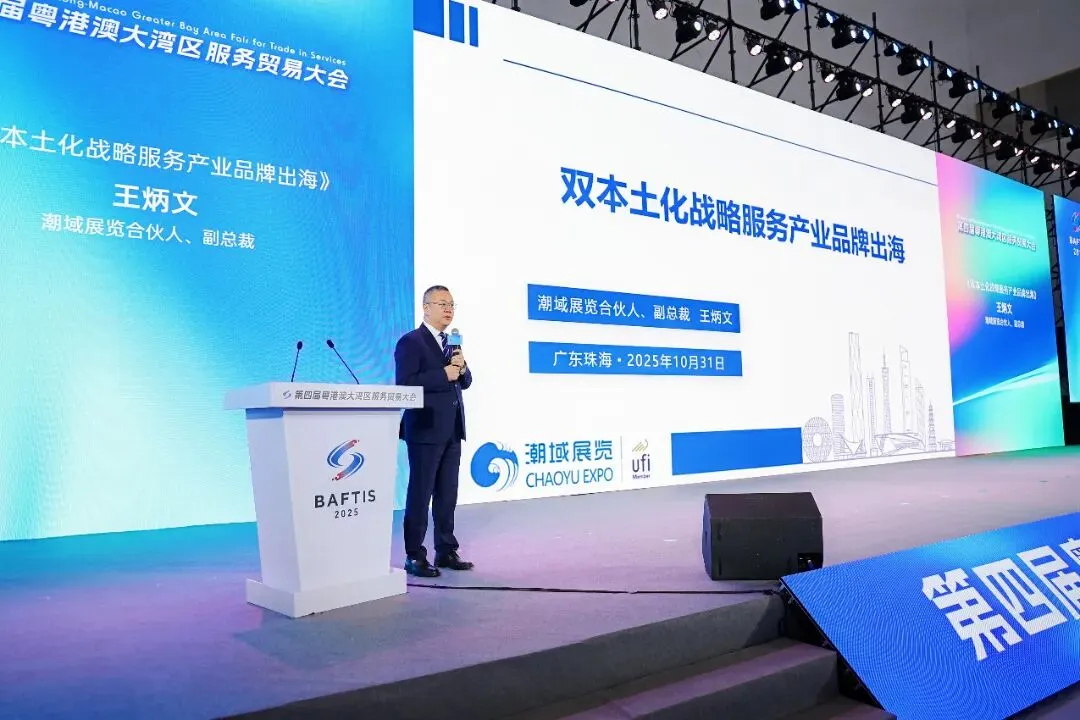 潮域展览合伙人、副总裁王炳文以《双本土化战略服务产业品牌出海》为主题,提出出海规模持续扩大、中国企业出海主体日益多元化等发展趋势。王总还提出,本土化顾问团队服务广东企业出海、本土化运营提升展会服务效果、专业化展会平台服务企业出海、聚焦新兴市场服务品牌出海、跨境电商展培育高质量出海主体等观点,通过双本土化战略,帮助中国企业深度融入目标市场,实现从“单次参展”到“长期品牌建设”的跨越。