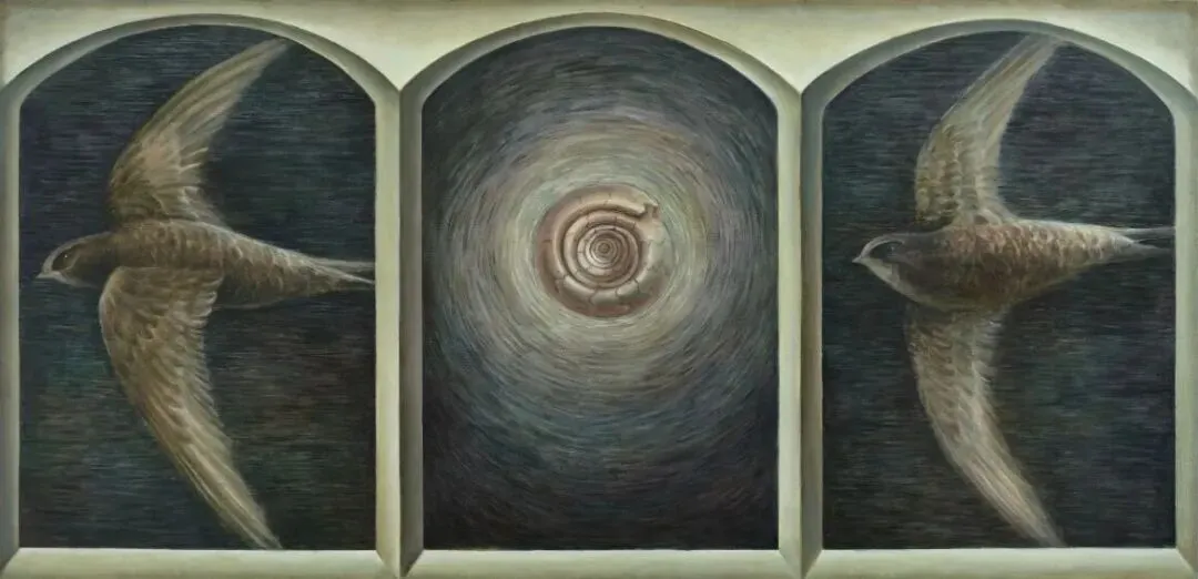 绘画上的巨大吊灯与之呼应,却不再庄严,而是近乎超现实地贴近地面,烘托看不见面庞的普通男子与身型十分矫健的狗。围绕着罗马柱的角落,两件三联的作品相互对仗。拱形的立体结构分隔动态的飞鸟与鹦鹉螺化石,中世纪绘画般的群星底色上则呈现了有关生殖的比喻。