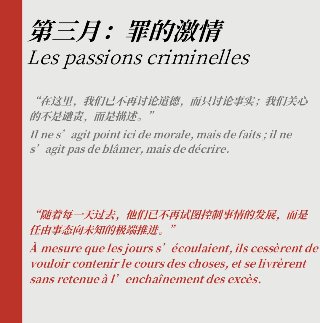这正合人本主义的精神,即深入人性的坦诚描摹后,人们发现规则与自由并非只是社会学层面的冲突,也同样是人性本身的悖论。在顺应规则时,缝隙与暗处滋长出更加绝对的自由与狂热。如萨德侯爵最后写下,“我们为一切设下规则,却终究无法支配事情将走向何方。”